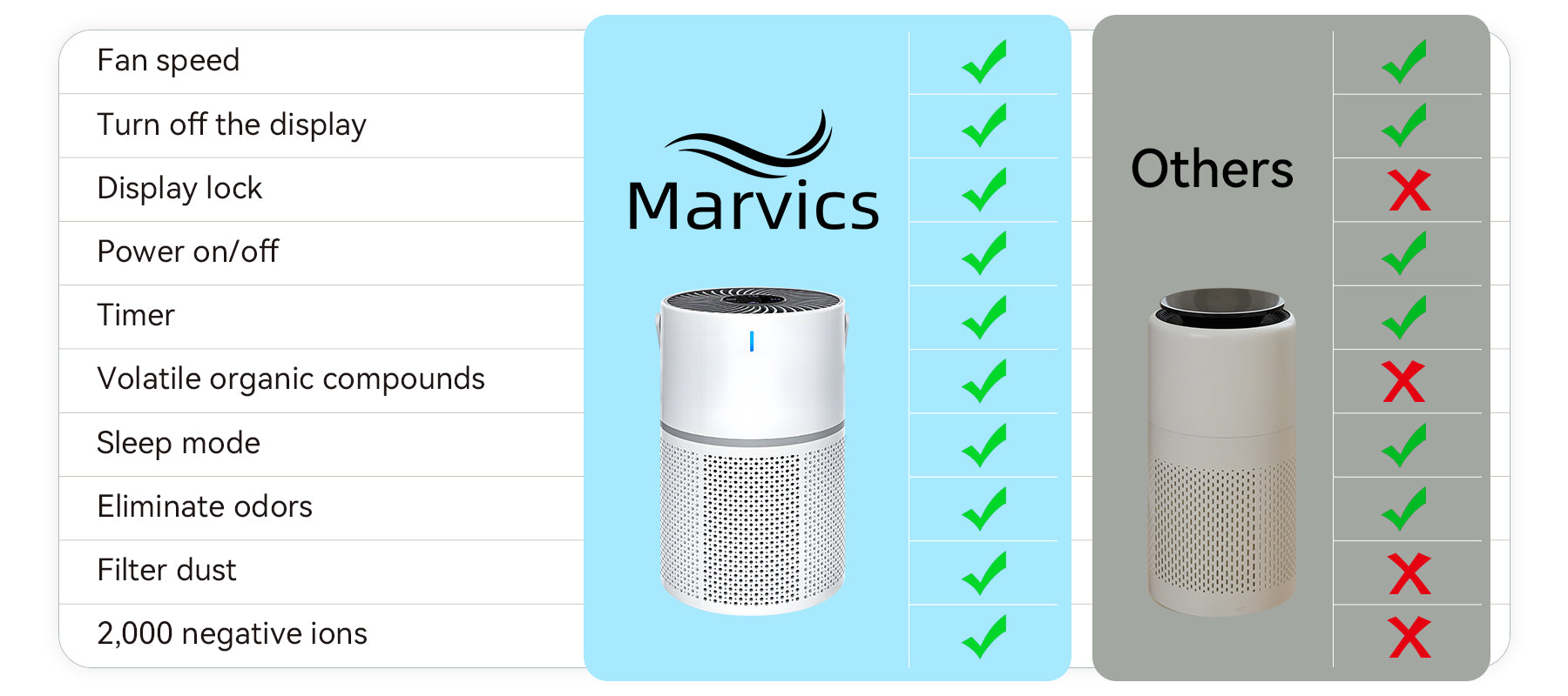 Marvics Air Purifieruses a specially designed low-speed fan that minimizes noise to the bare essentials. Paired with a soft LED night light, it silently purifies the air, creating a tranquil and healthy sleeping environment for you and your family.