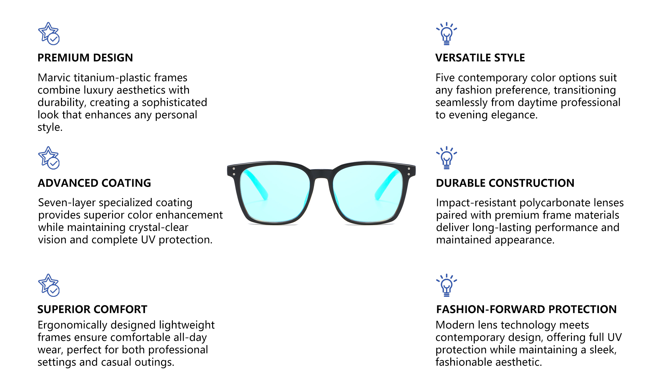 Premium polycarbonate lenses with specialized multi-layer coating, housed in a stylish titanium-plastic frame. Features UV protection and color enhancement technology for improved daily vision.